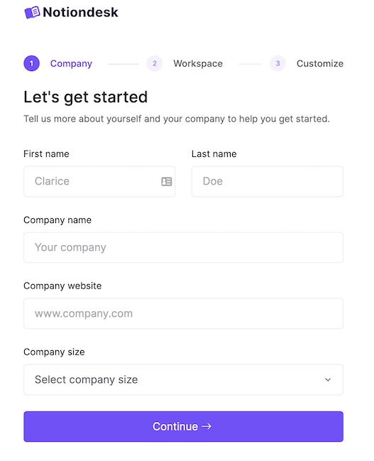 Pour commencer à utiliser Notiondesk pour assister vos clients, vous devrez d'abord créer un compte et connecter votre espace de travail Notion.